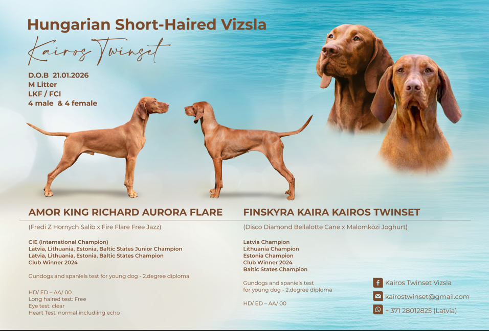 Vanemad on näitusemeistrid, läbinud terviseuuringud (mõlemal HD/ED – AA/00) ning sooritanud jahikatseid.