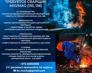 Требуются Сварщики MIG/MAG 135/136, Слесаря-Сборщики, Маляра-Металлоконструкции.