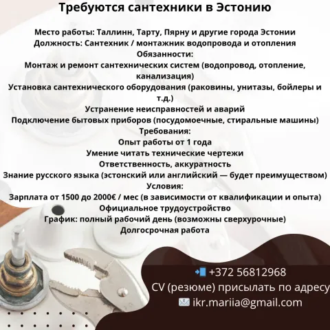 Место работы: Таллинн, Тарту, Пярну и другие города Эстонии