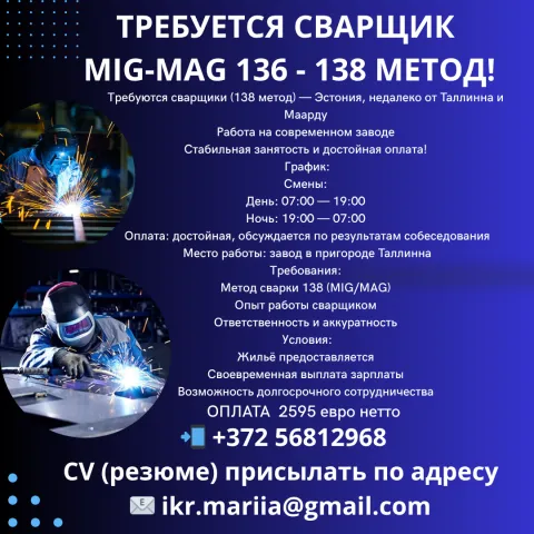 Эстония! Недалеко от Таллинна в сторону Маарду требуется квалифицированный сварщик! 136 (механизированная сварка .) 138 (механизированная сварка, но с использованием металлического порошкового электрода).